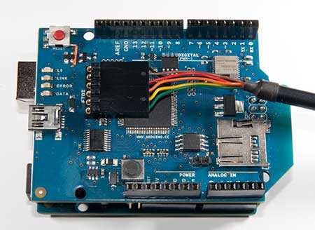 There is an onboard micro-SD card slot, which can be used to store files for serving over the network. It is compatible with the Arduino Uno and Mega. The onboard microSD card reader is accessible through the SD Library. When working with this library, SS is on Pin 4.